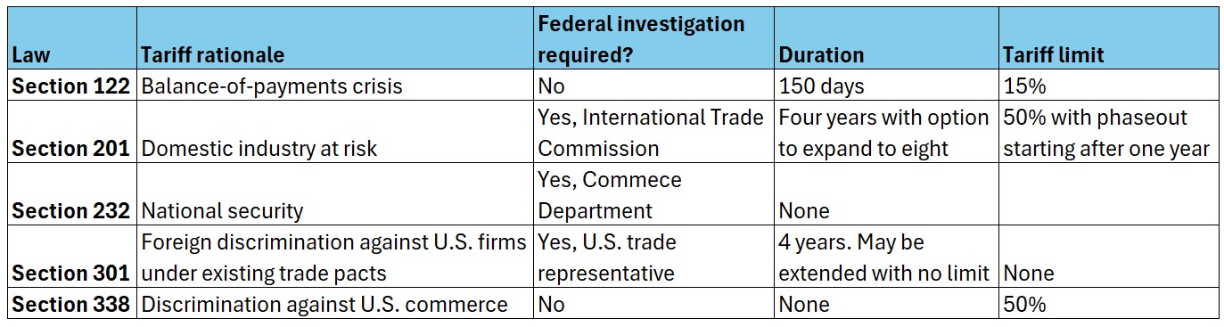 While there are other statutory bases for imposing tariffs, like Section 301 of the 1974 Trade Act and Section 232 of the 1962 Trade Expansion Act, they are more procedurally burdensome, hence why the administration avoided using them in the first place.